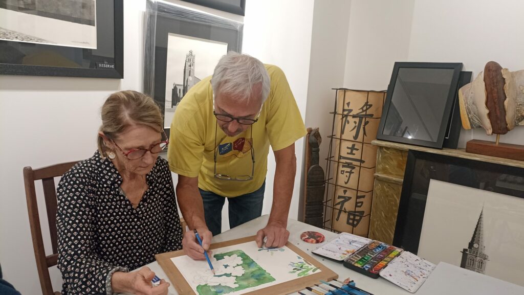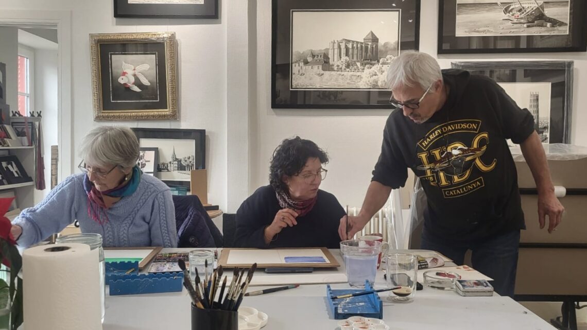 A mon atelier, cours d’aquarelle deux jeudis après midi par mois, maximum 6 participants, matériel aquarelle, pinceaux, papier fournis.